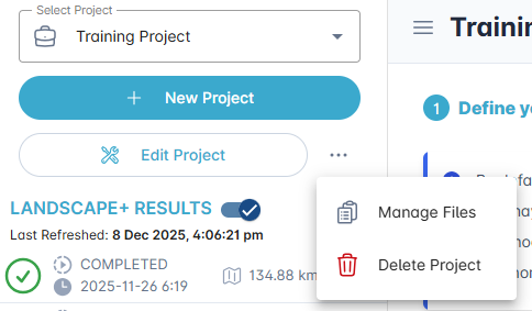 If you wish to delete an entire project, including all associated data, uploaded files, and results, you can do so from the project menu.